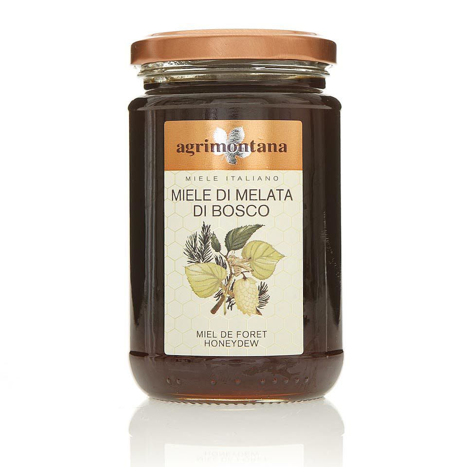 Honeydew honeyOrigin: Piedmont forests. Crystallisation: taken from the sap of plants, unlike honey, honeydew does not crystallise. Colour: very dark. Fragrance: intense and penetrating. Flavour: less sweet than honey nectar, it has a distinctive malty and dry prunes aftertaste.